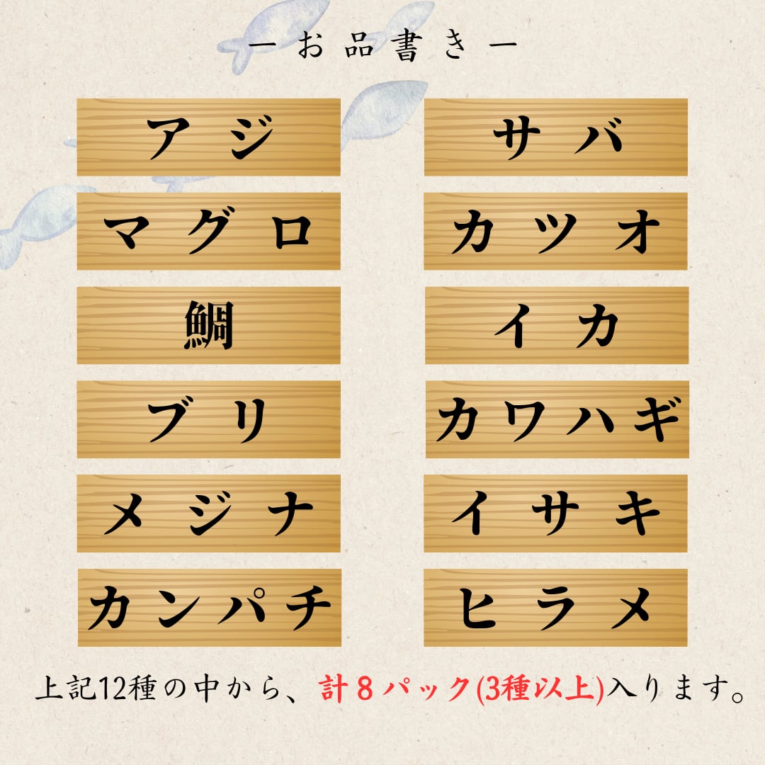 海鮮漬け丼の素8パック(3種以上)をおまかせでお届けいたします。